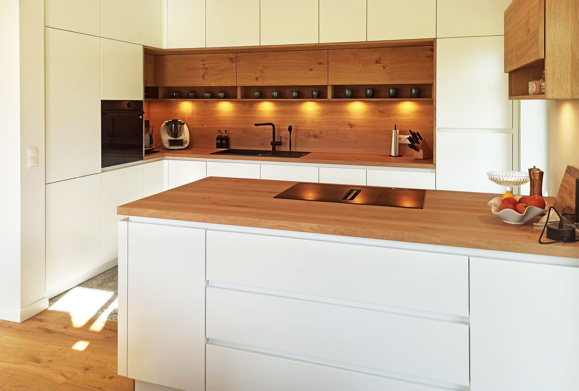 Wir entwickelten ein ganzheitliches Innenausbaukonzept in Eiche und Weiß, integrierten eine großzügige Insel, eine nahezu unsichtbare Tür zum Hauswirtschaftsraum und nahmen das breite Panoramafenster als gestalterischen Ausgangspunkt der Planung.